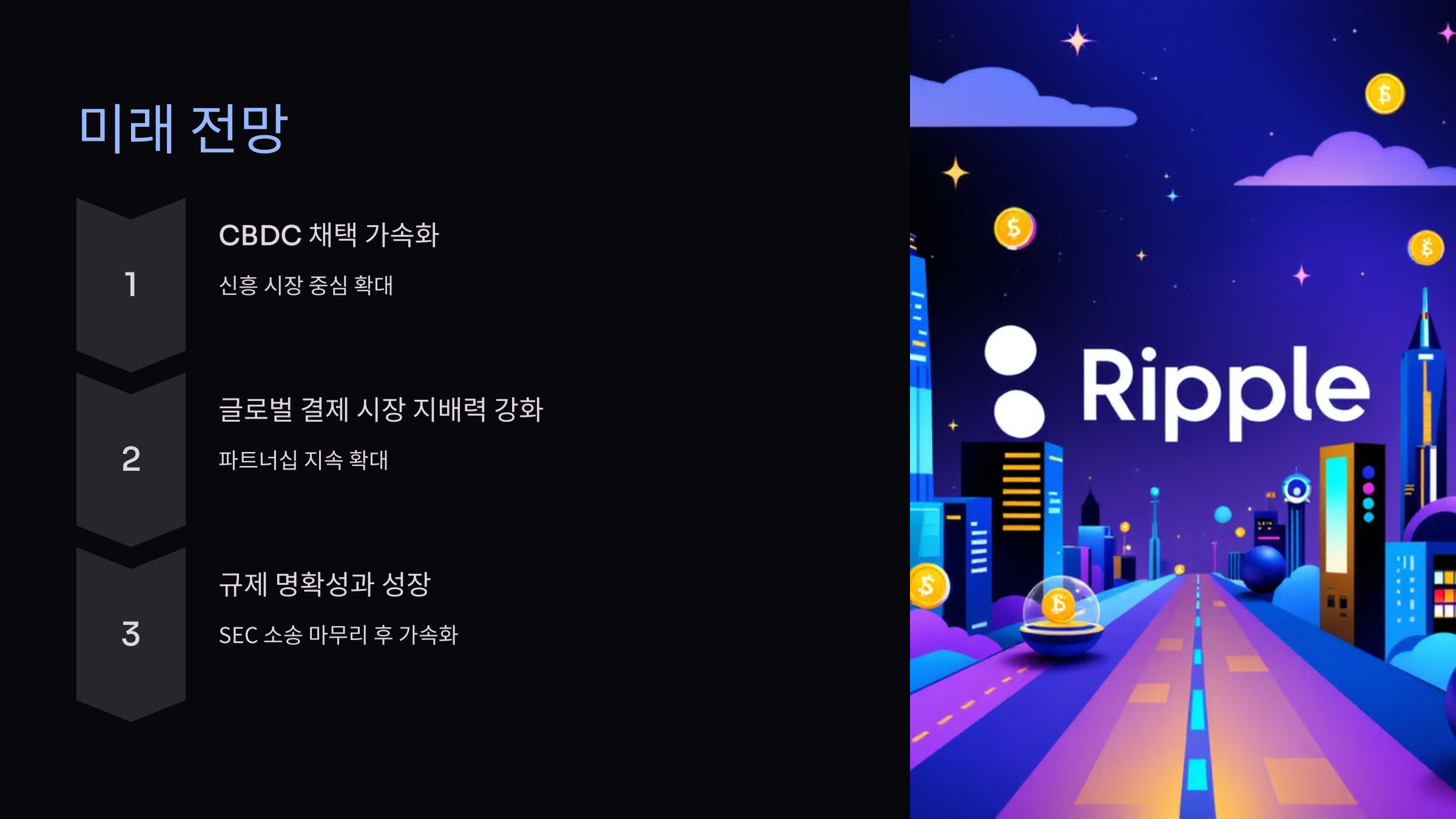SEC 소송이 마무리되고 규제 환경이 명확해지면, 리플의 CBDC 플랫폼과 글로벌 파트너십 확장은 더욱 가속화될 것입니다.