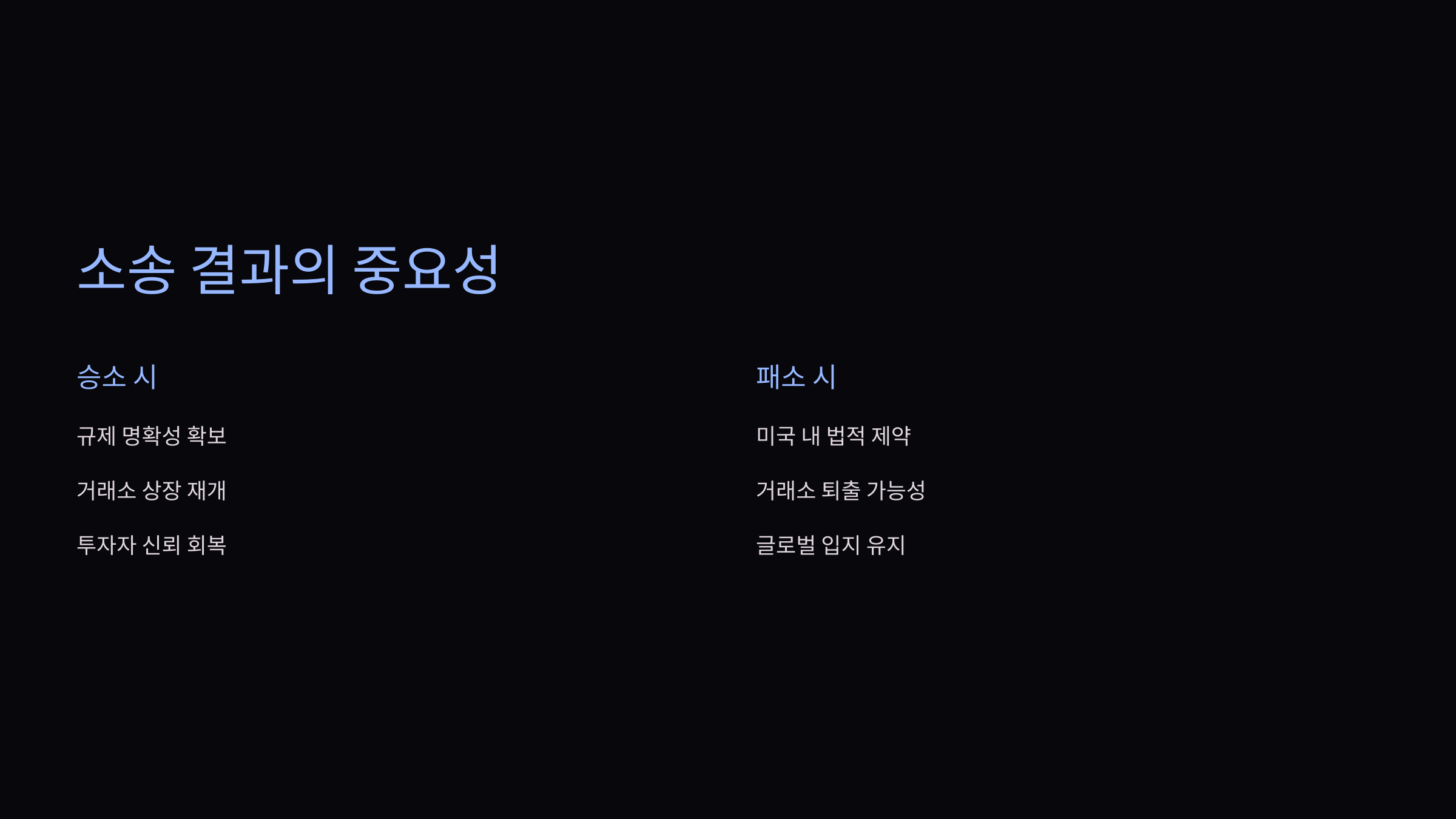 - SEC 소송 결과가 긍정적으로 나오면, 기관 투자자들의 유입이 가속화될 것으로 예상됩니다.