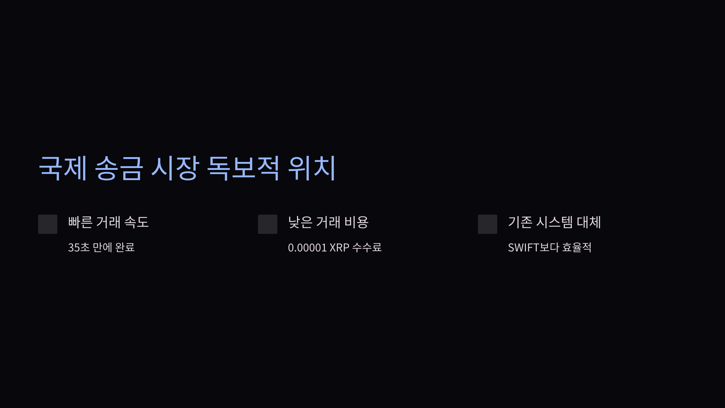 XRP를 사용하면 국제 송금이 35초 만에 완료되며, 이는 SWIFT 등 전통적인 금융 네트워크의 느린 처리 시간(13일)과 비교해 투자자들에게 매력적인 요소로 작용합니다. - 낮은 거래 비용