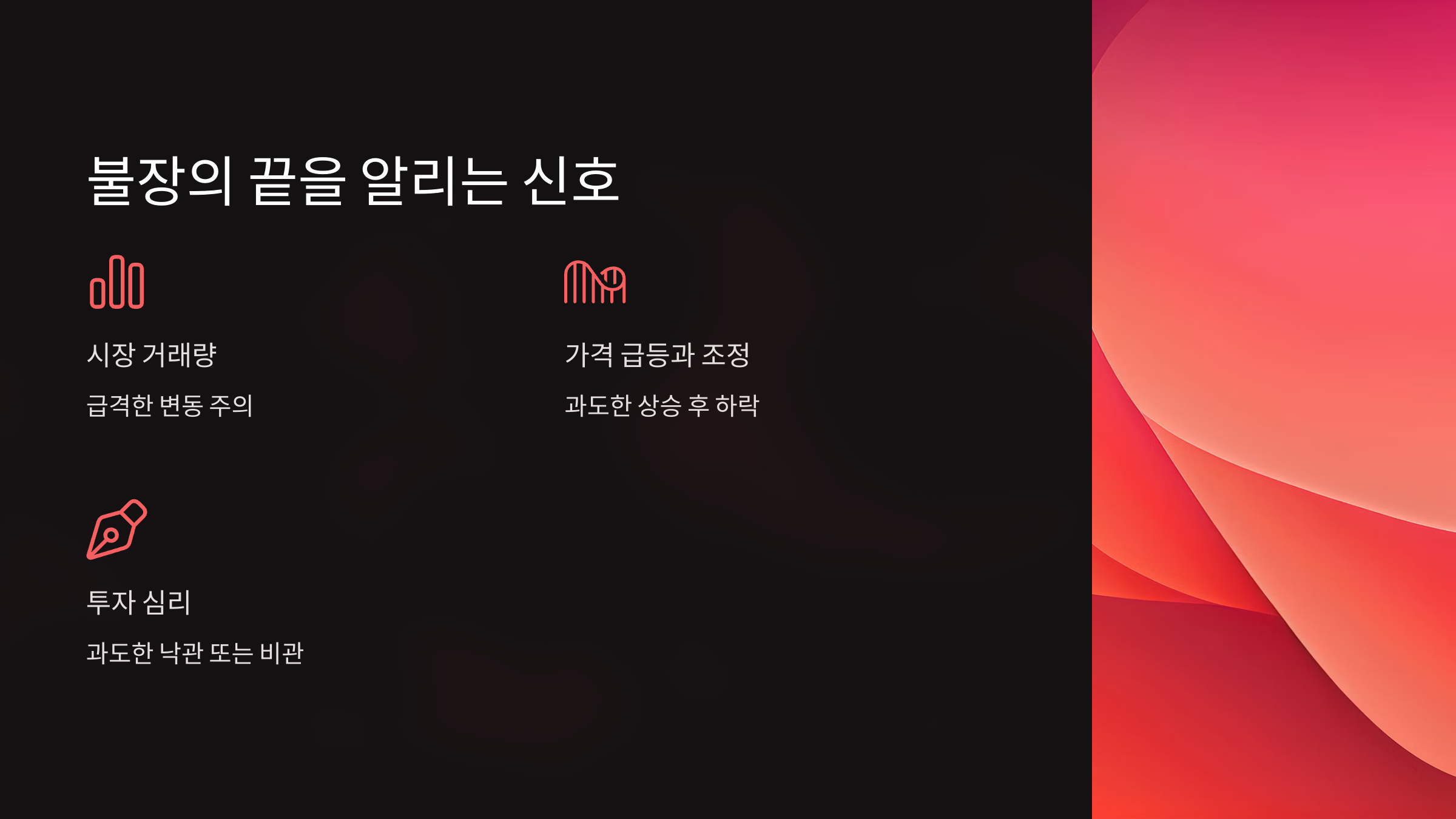 시장의 투자 심리가 과도하게 낙관적이거나 과소평가될 때, 이는 불장이 끝날 준비가 되었다는 신호일 수 있습니다. 예를 들어, 투자자들이 "가격이 더 이상 오를 수 없다"고 판단하는 순간 불장이 끝날 수 있습니다.