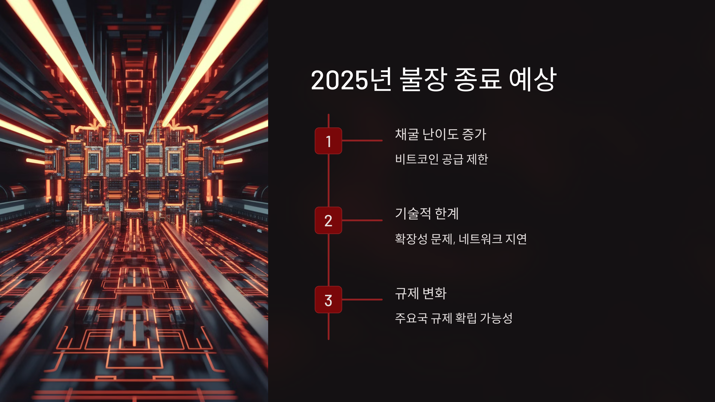 2025년 불장이 언제 끝날지 정확히 예측하기는 어렵지만, 여러 전문가들은 2025년 하반기부터 불장이 끝날 가능성에 대해 언급하고 있습니다. 그 이유는 다음과 같습니다.