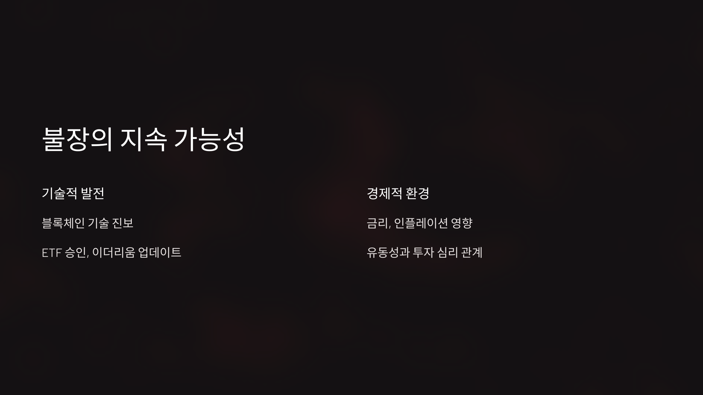 블록체인 기술의 발전과 암호화폐의 실제 사용 사례 확대가 불장의 중요한 원동력입니다. 특히, 비트코인 ETF의 승인, 스마트 계약 기능이 강화된 이더리움의 업데이트, 그리고 DeFi와 NFT의 발전은 시장에 긍정적인 영향을 미칩니다. 기술이 지속적으로 발전하고 채택이 확대될수록 불장은 더 오랫동안 지속될 가능성이 큽니다. - 경제적 환경: