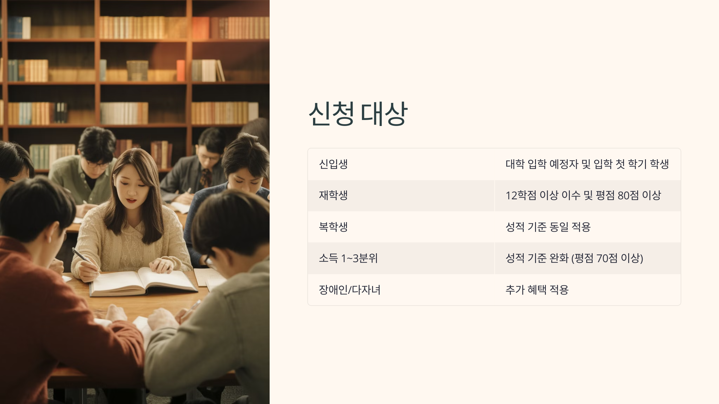 저소득층 가구 학생 | 성적 기준 일부 완화 (12학점 이상 이수 및 평균 평점 70점 이상) |