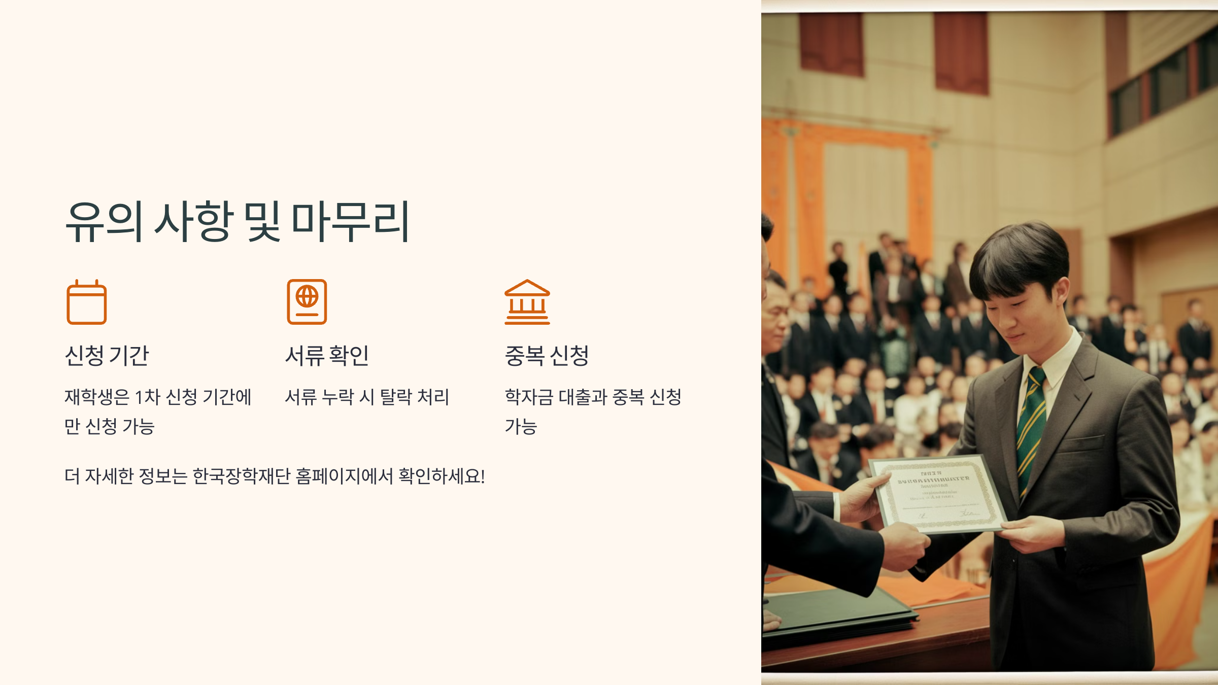 국가장학금은 대학생들이 학업에 집중할 수 있도록 큰 도움을 주는 제도입니다. 신청 기간과 조건을 미리 확인하고 빠르게 신청해보세요! 더 자세한 정보는 한국장학재단 홈페이지에서 확인할 수 있습니다.
