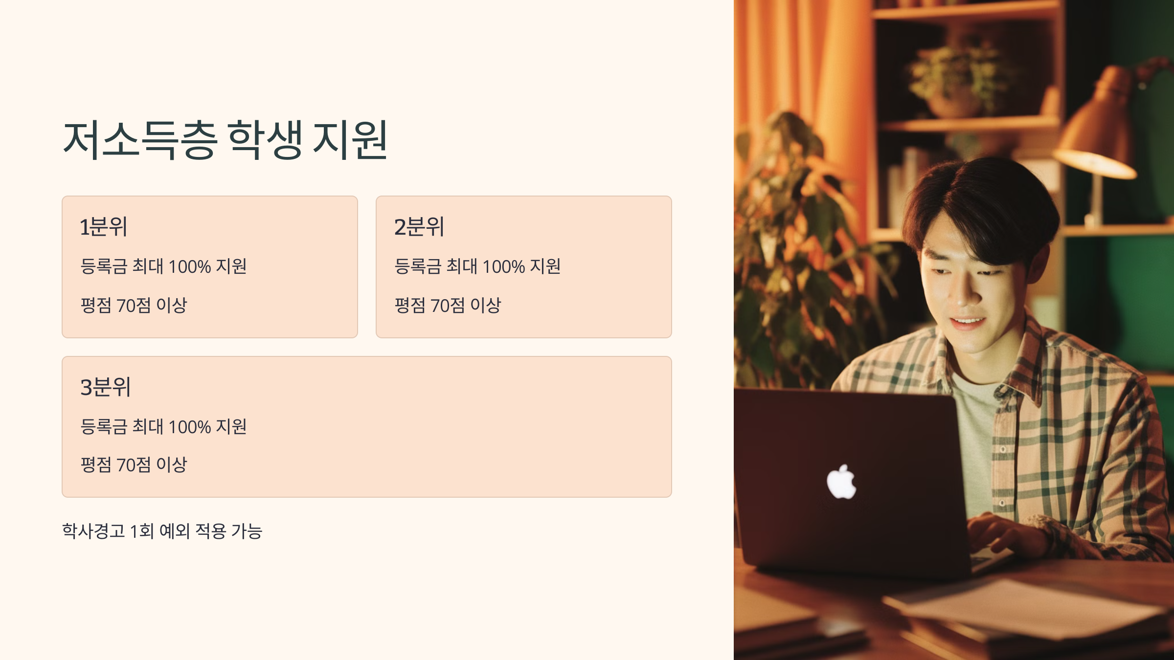 | 3분위 | 등록금 최대 100% 지원 | 평균 평점 70점 이상 | 학사경고 예외 적용 가능 |