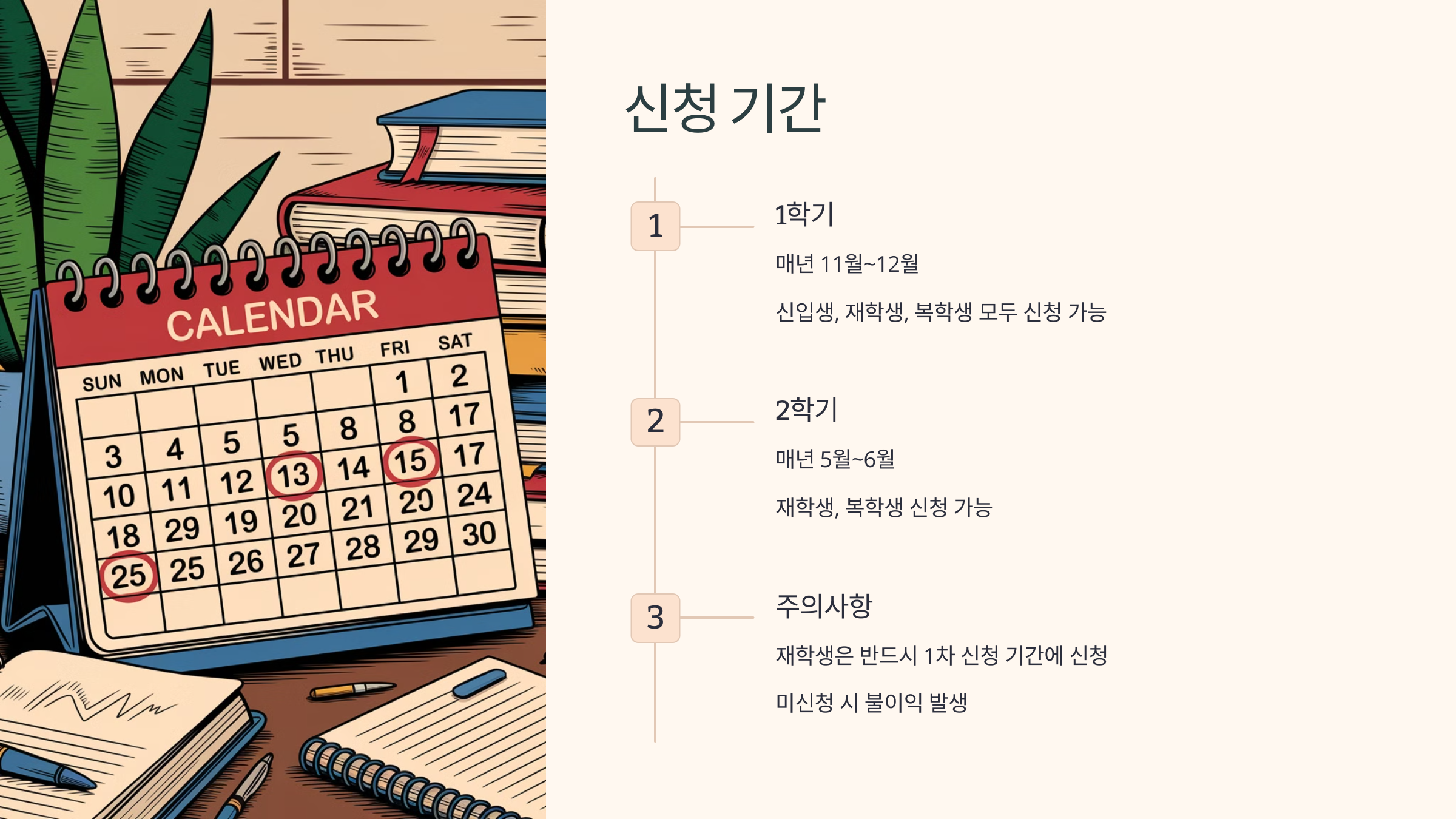 | 2학기 | 매년 5월 ~ 6월 | 재학생, 복학생 |