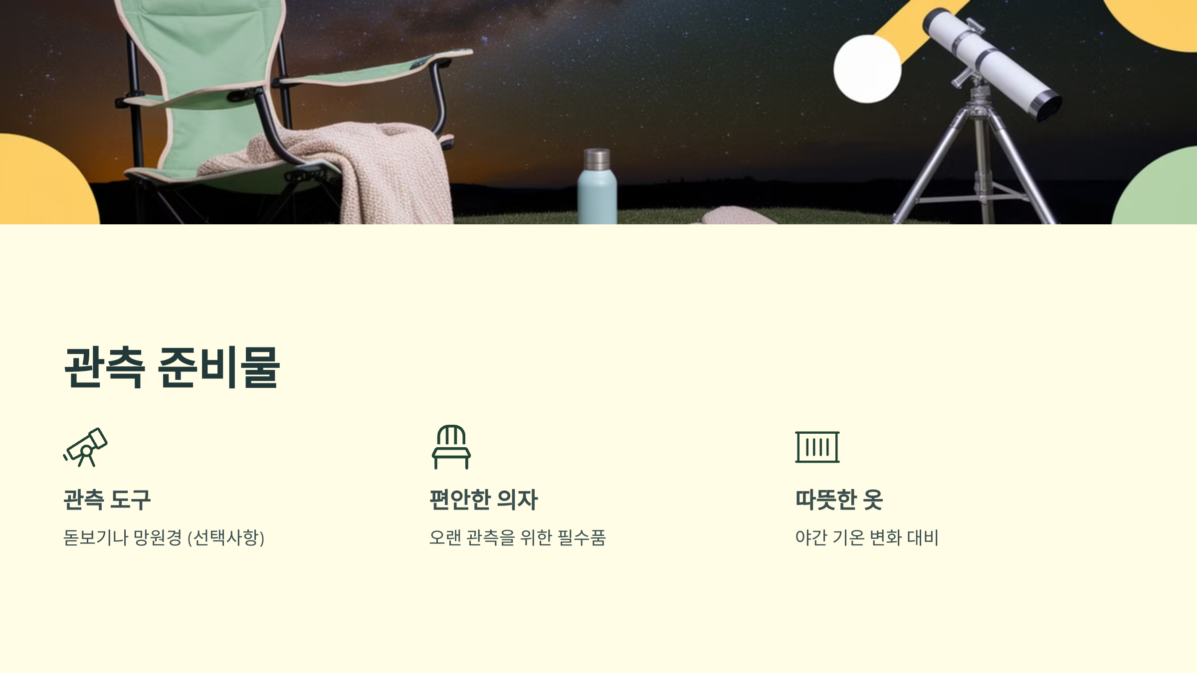 | 따뜻한 옷 | 자정부터 새벽까지 관측하는 동안 추울 수 있으므로 따뜻한 옷을 준비하세요. |