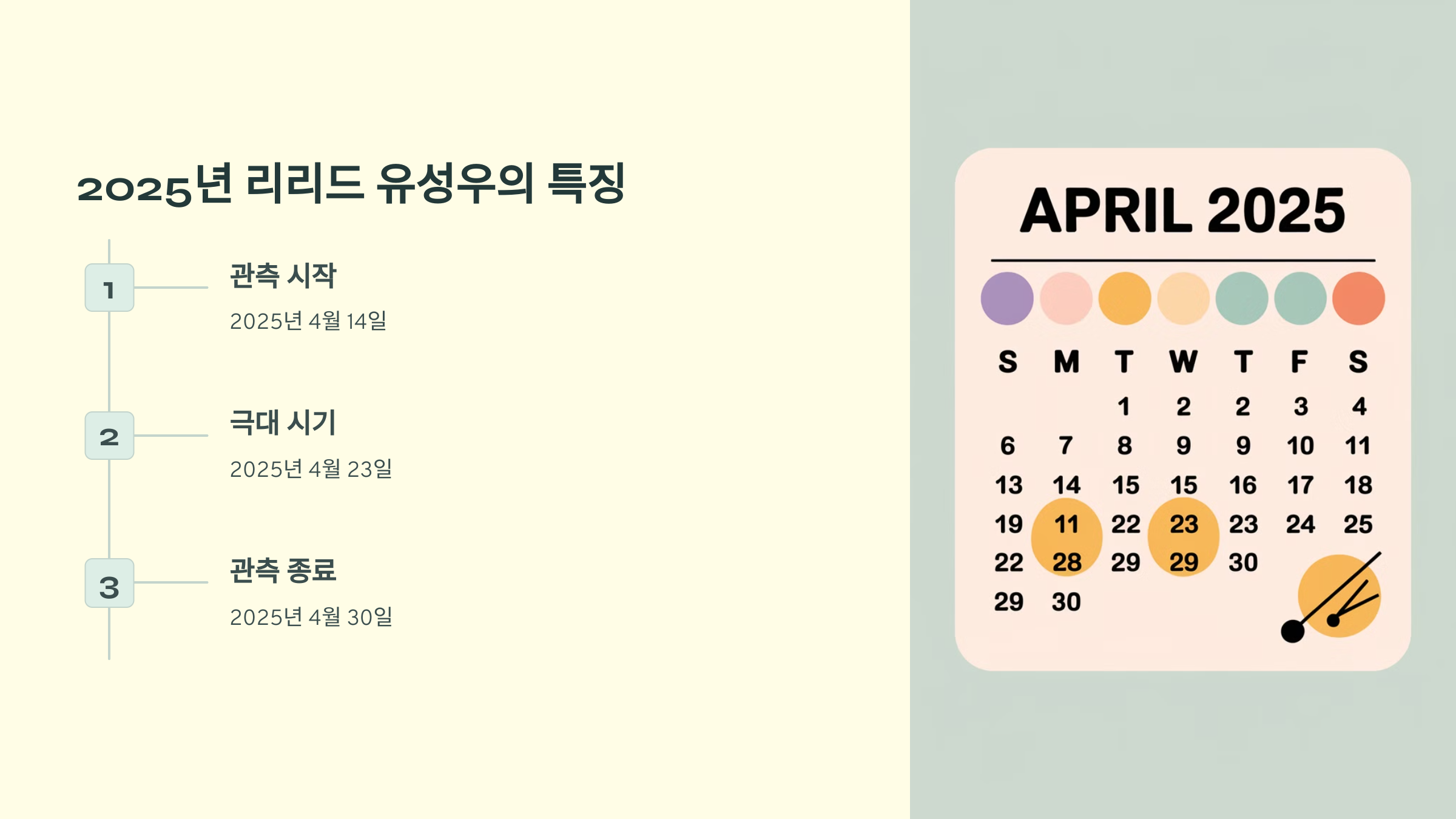 | 2025년 리리드 유성우의 극대 시기는 언제인가요? | 2025년 리리드 유성우의 극대 시기는 4월 23일입니다. |