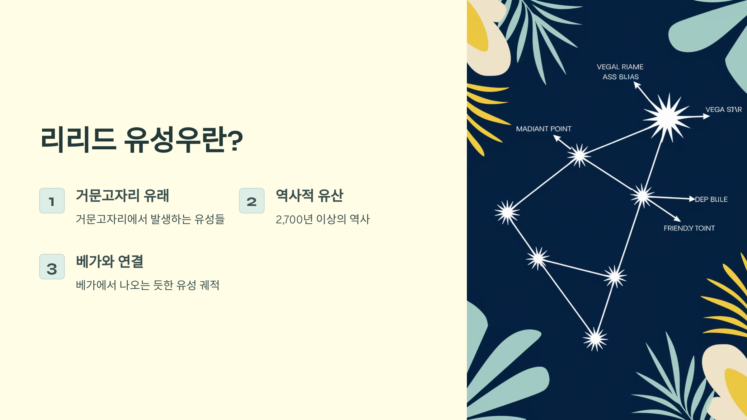 리리드 유성우(Lyrid Meteor Shower)는 매년 4월에 하늘을 수놓는 유성우로, 거문고자리에서 발생하는 유성들이 지구 대기권에 돌입하면서 발생합니다. 이 유성우는 약 2,700년 이상의 역사를 자랑하며, 고대 문헌에도 등장하는 유명한 유성우입니다. 리리드 유성우의 이름은 거문고자리의 별, 베가와 관련이 있습니다. 그 별에서 나오는 듯한 유성의 궤적이 하늘을 가로지르기 때문입니다.