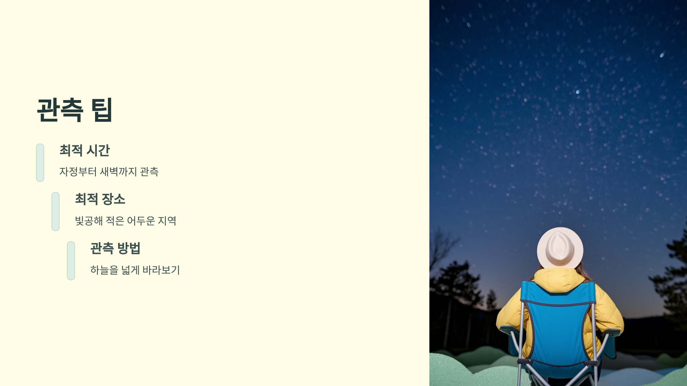 - 최적 관측 장소: 빛공해가 적은 어두운 지역