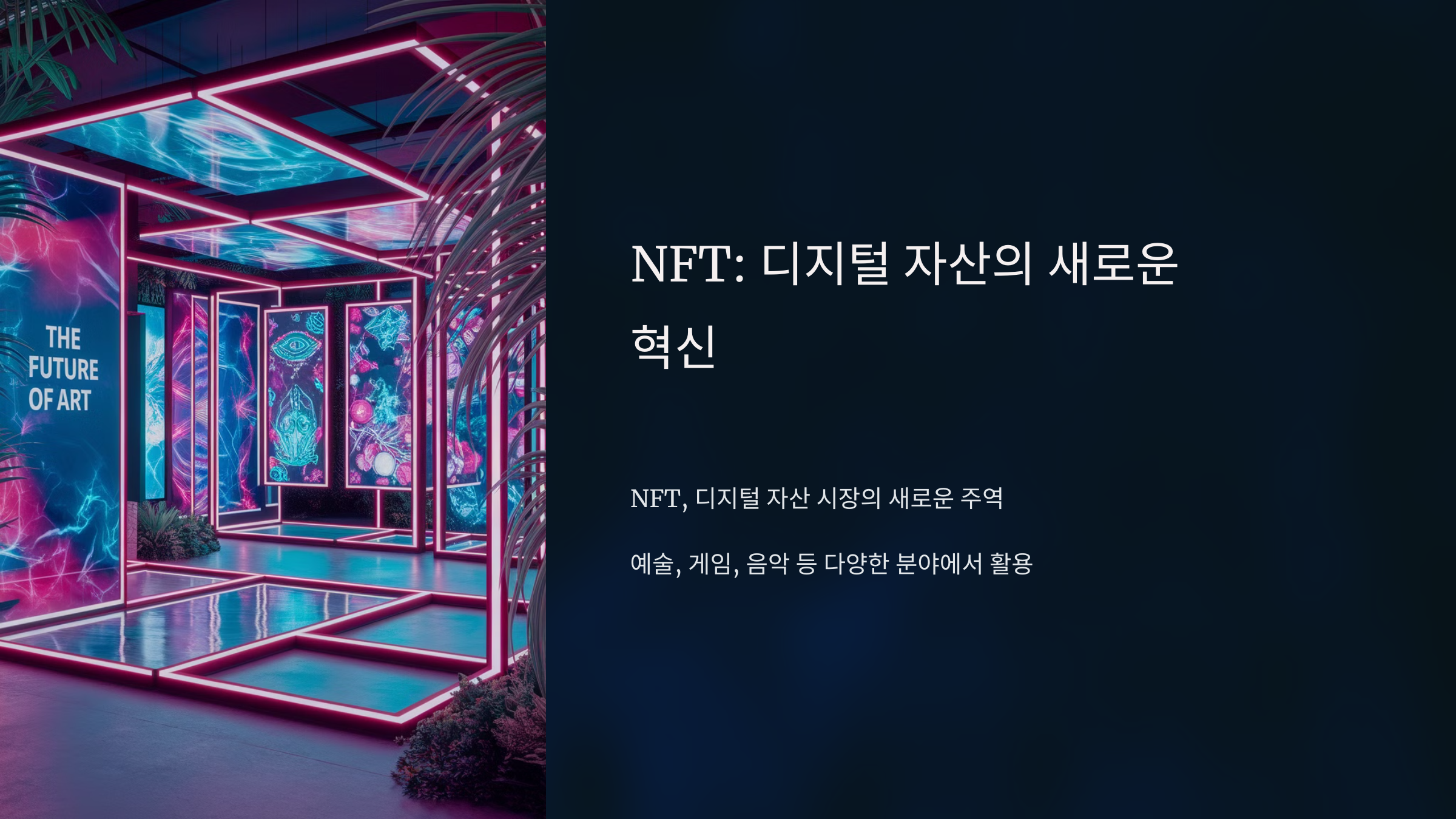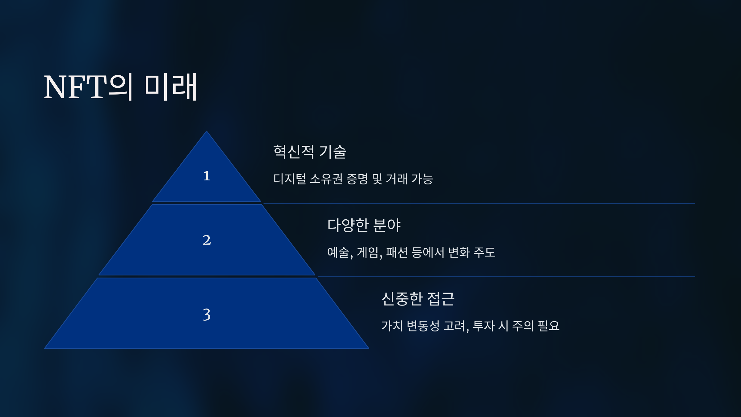 NFT는 디지털 자산의 새로운 형태로, 예술과 게임, 패션 등 다양한 분야에서 큰 변화를 일으키고 있습니다. 그러나 그 가치는 시장의 수요와 희소성에 따라 달라지므로, 투자자는 신중히 접근해야 합니다. NFT는 단순한 트렌드가 아닌, 디지털 소유권을 증명하고 거래할 수 있는 혁신적인 기술로 자리잡고 있습니다.