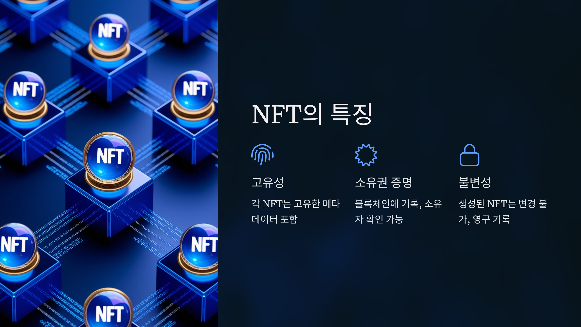 - 불변성: 한 번 생성된 NFT는 변경할 수 없으며, 블록체인에 기록된 정보는 영구적으로 유지됩니다.