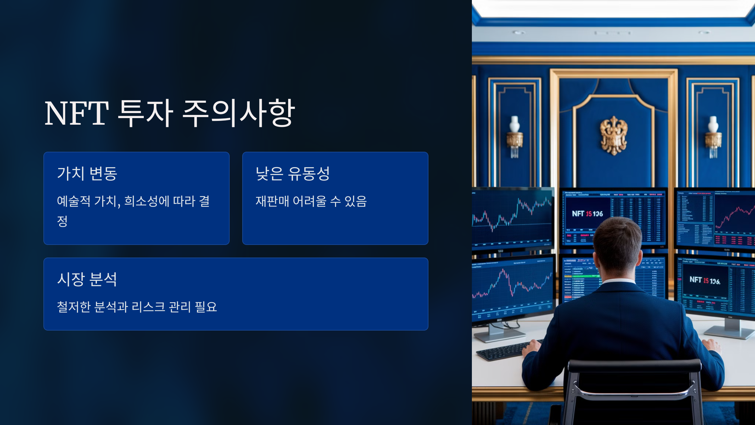 NFT는 매우 새로운 시장이기 때문에 투자 시 주의가 필요합니다. NFT의 가치는 예술적 가치나 희소성에 따라 결정되므로, 시장에서의 수요 변화에 따라 크게 변동할 수 있습니다.