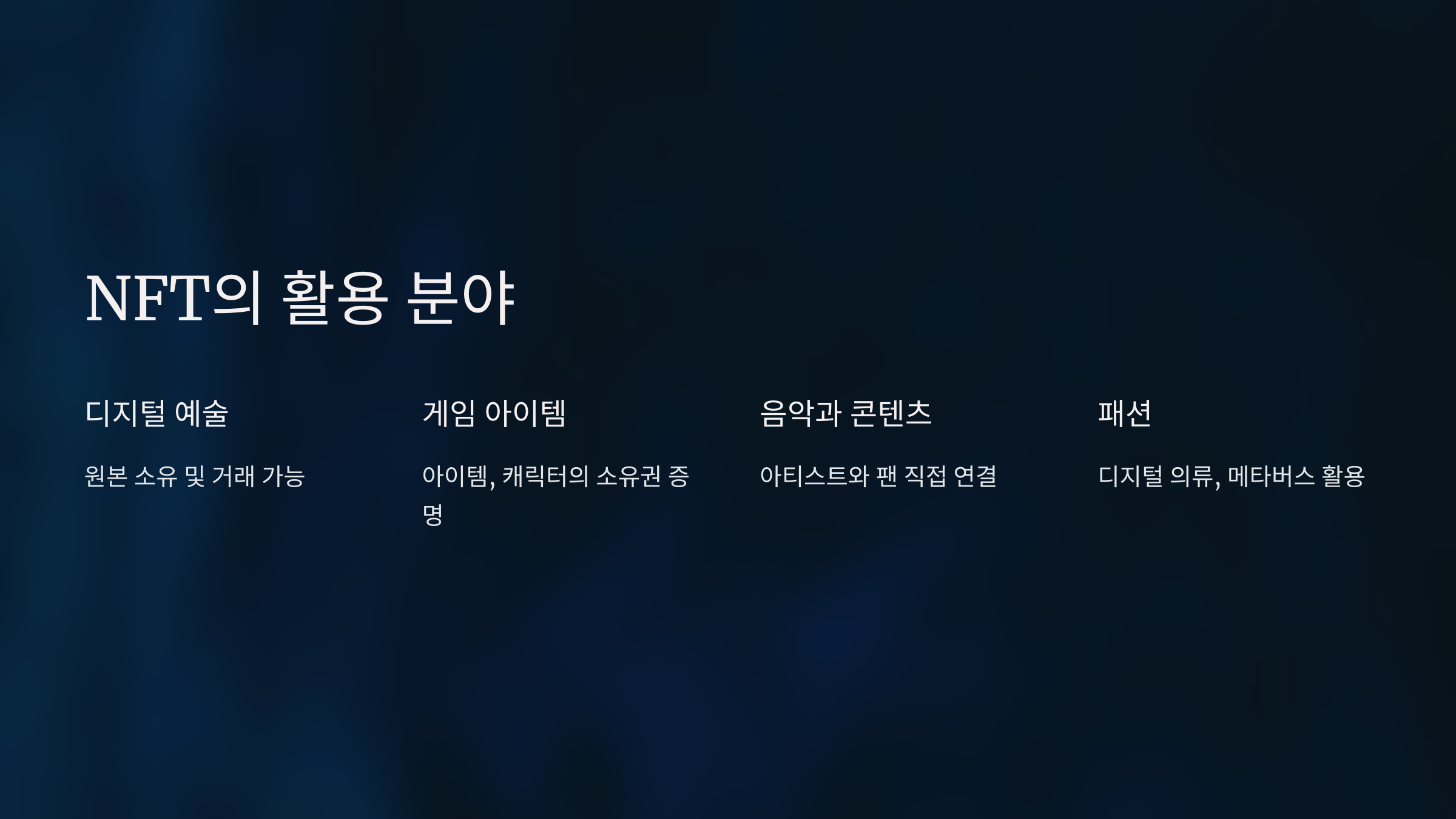 NFT는 다양한 분야에서 활용되고 있으며, 특히 디지털 예술, 게임, 음악, 그리고 패션 산업에서 두각을 나타내고 있습니다.