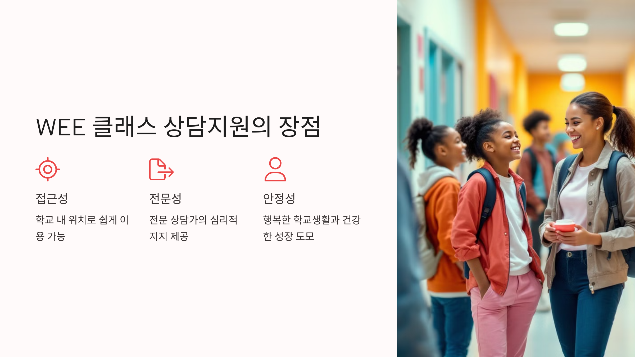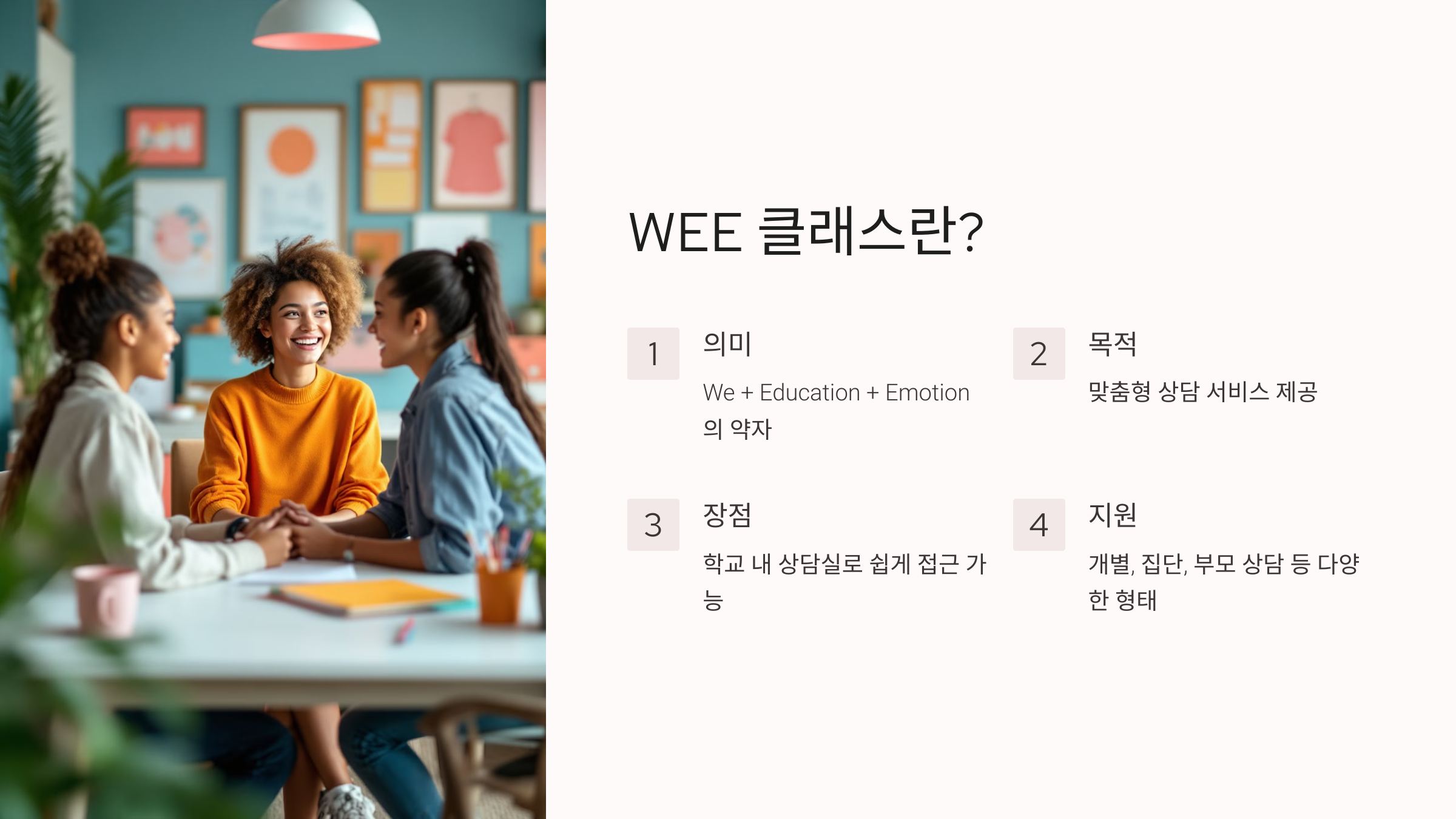 학교 내 위치한 WEE 클래스는 학생이 쉽게 접근할 수 있도록 운영됩니다. 바쁜 일과 중에도 시간을 내어 방문할 수 있기 때문에 언제든지 자신의 문제를 공유하고 도움을 요청할 수 있습니다. - 전문적인 상담 전문가