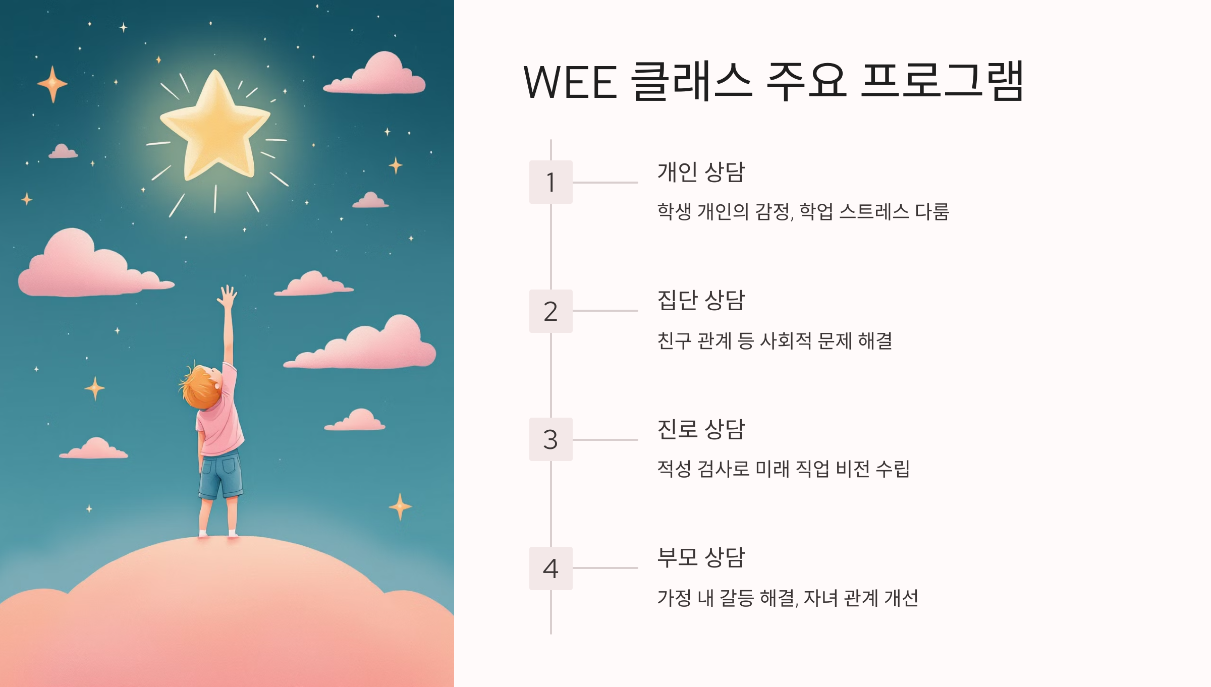 WEE 클래스는 학생 개인의 상황에 따라 다양한 프로그램을 제공하여 보다 포괄적인 상담을 제공합니다.