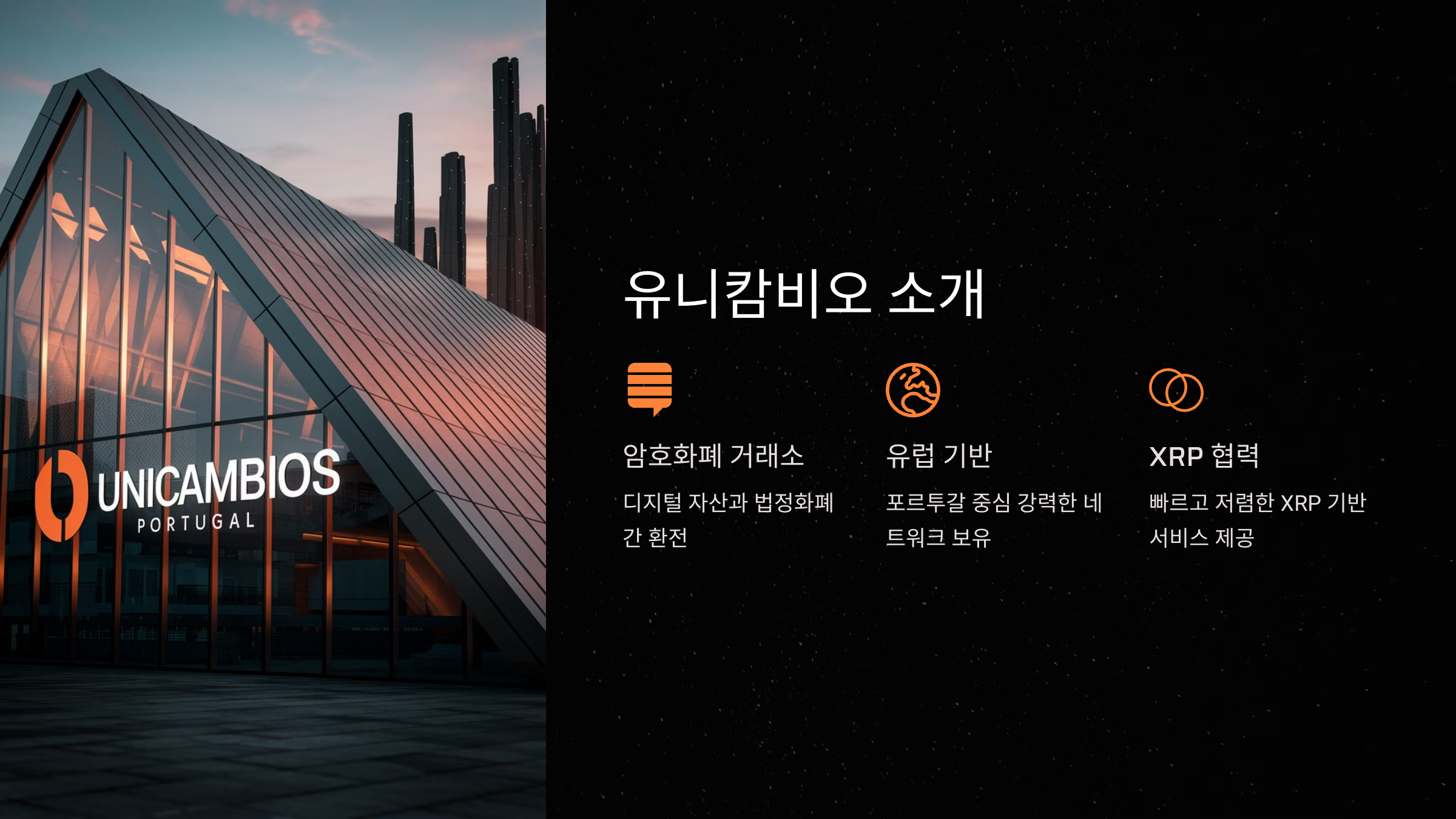 유니캄비오는 포르투갈을 기반으로 하는 암호화폐 거래소이자 환전 서비스 제공 업체로, 다양한 디지털 자산과 법정화폐 간의 환전 및 송금 서비스를 운영하고 있습니다.