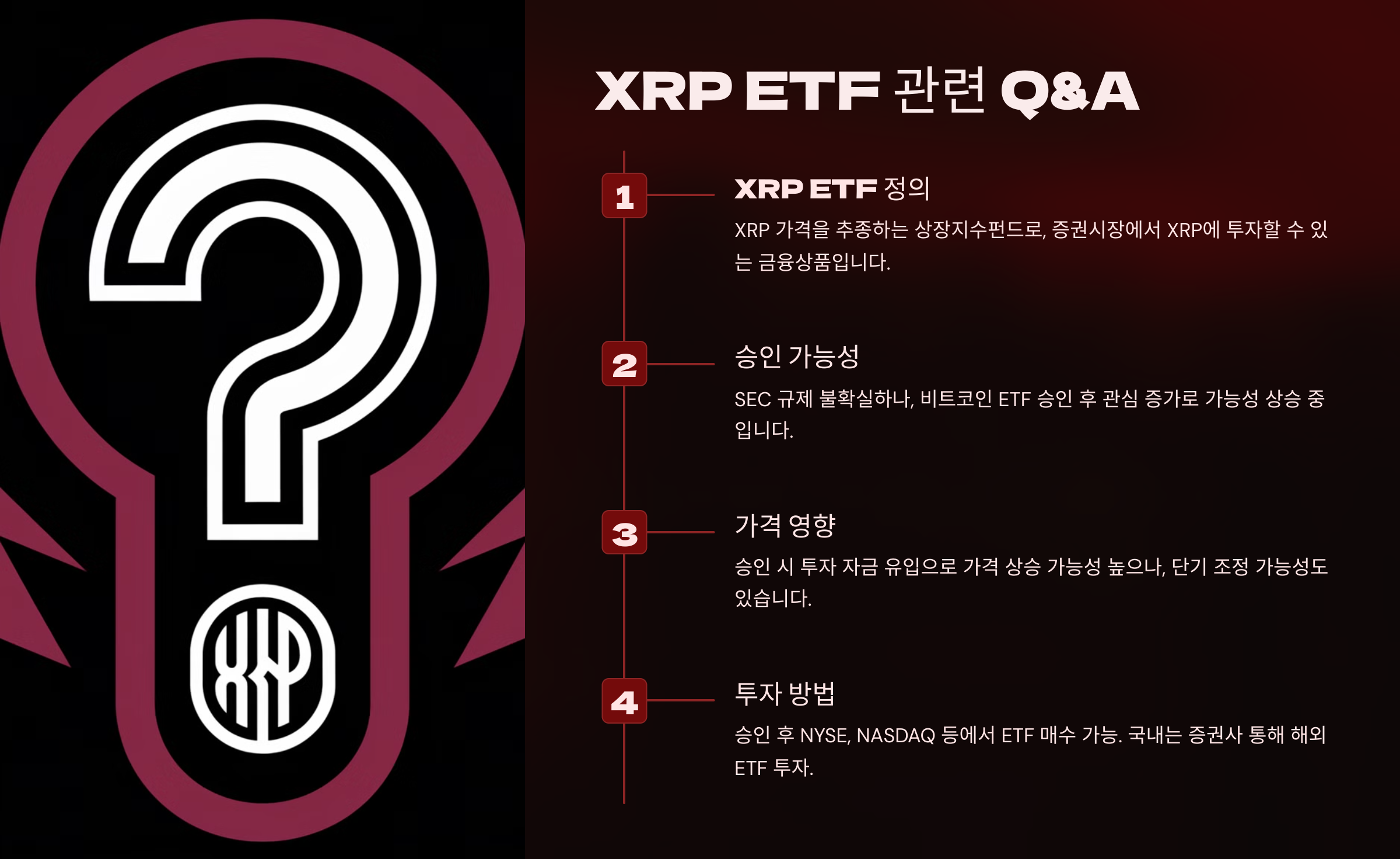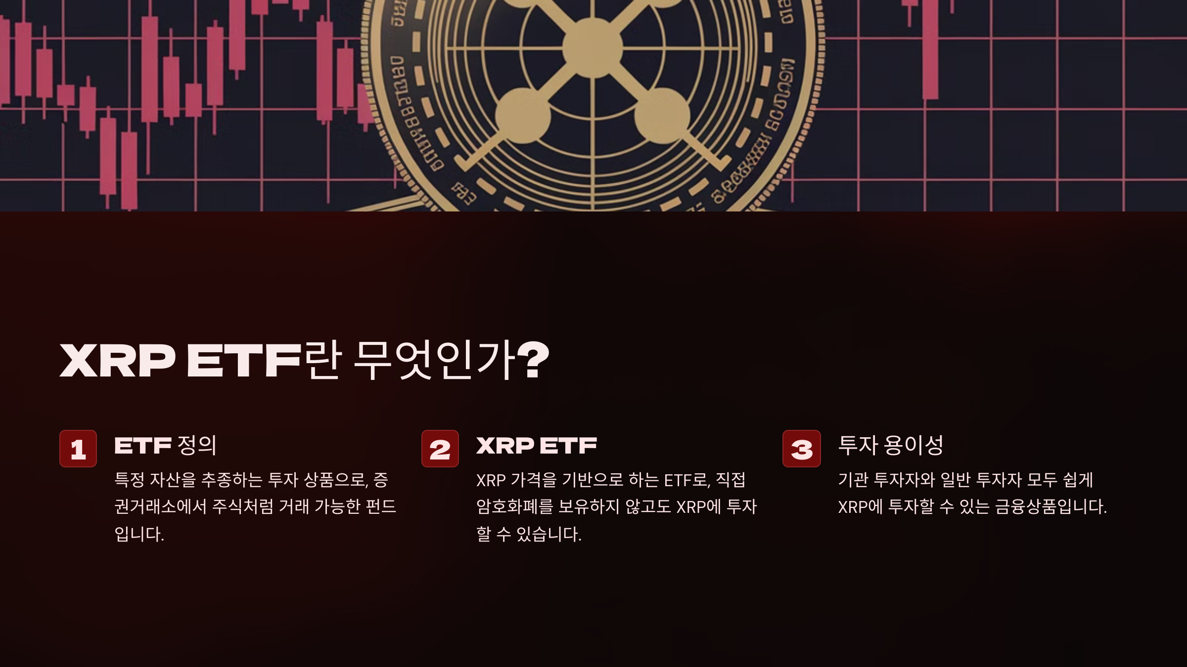 XRP ETF는 XRP의 가격을 기반으로 하는 ETF로, 기관 투자자들과 일반 투자자들이 직접 암호화폐를 보유하지 않아도 쉽게 XRP에 투자할 수 있는 금융상품입니다.
